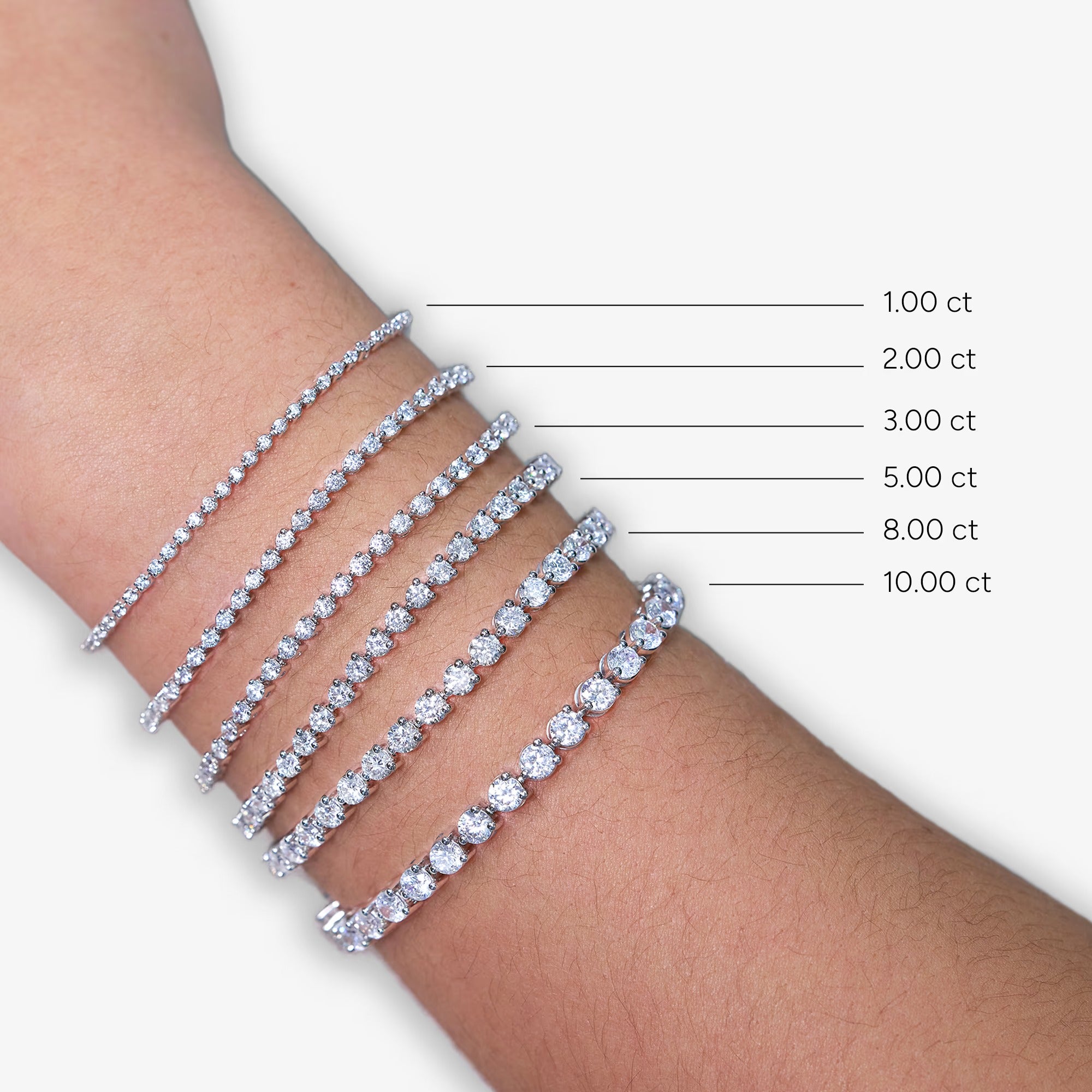 This tennis bracelet features round lab-grown diamonds, each expertly secured with a three-prong setting for enhanced durability and refined elegance. The minimalist design highlights the brilliance of every stone, creating a sophisticated accessory that commands admiration.