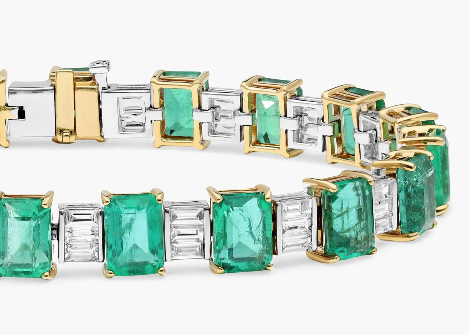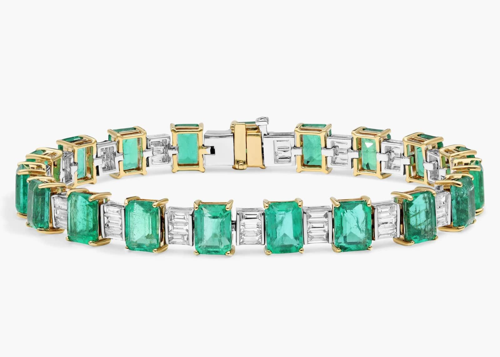 Inspired by the glamour of its namesake city, the Dubai bracelet is a breathtaking fusion of vivid emeralds and sleek diamond baguettes—expertly arranged for maximum brilliance. Set in radiant 18k yellow gold, this piece is a true masterpiece of contrast, color, and craftsmanship.