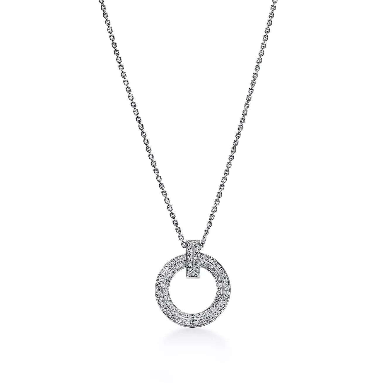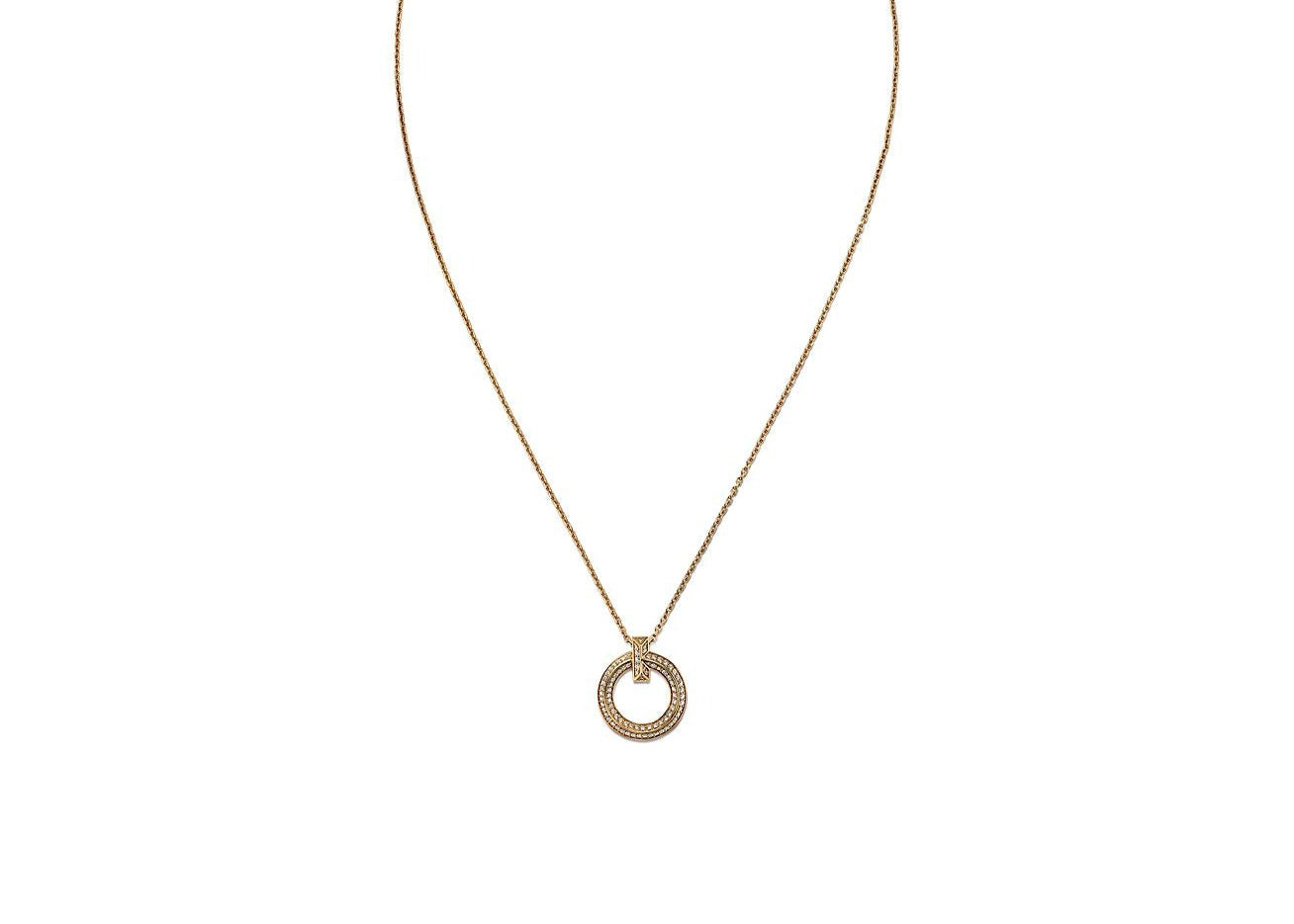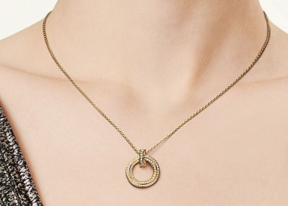 This slender circle pendant in yellow or white gold, adorned with Pavé diamonds, captures and reflects light beautifully across its refined contours.