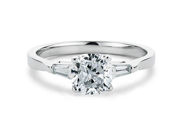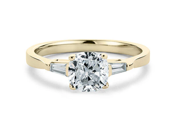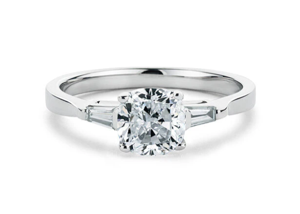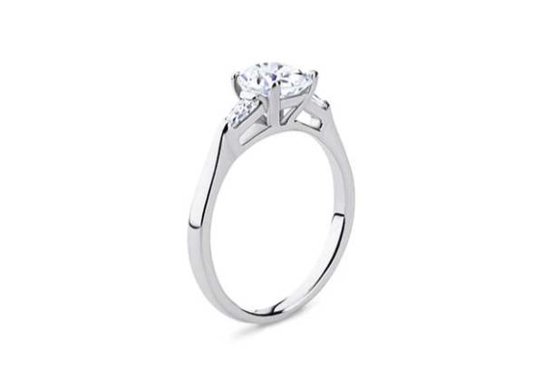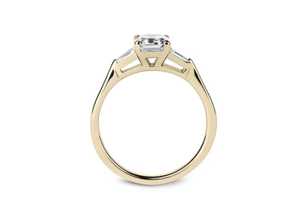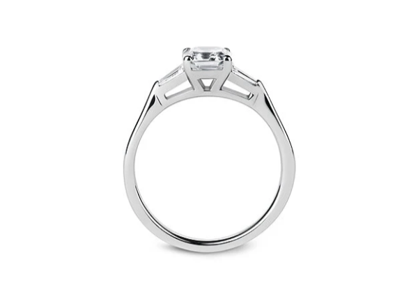 This sleek trilogy engagement ring offers a stunning balance of clean lines and radiant beauty. A brilliant center diamond is flanked by two elegant tapered baguette-cut diamonds, creating a sophisticated silhouette that symbolizes your past, present, and future. The tapered band with open daylight shoulders invites natural light to flow through the stones, enhancing their sparkle and giving the ring its striking, contemporary appeal.